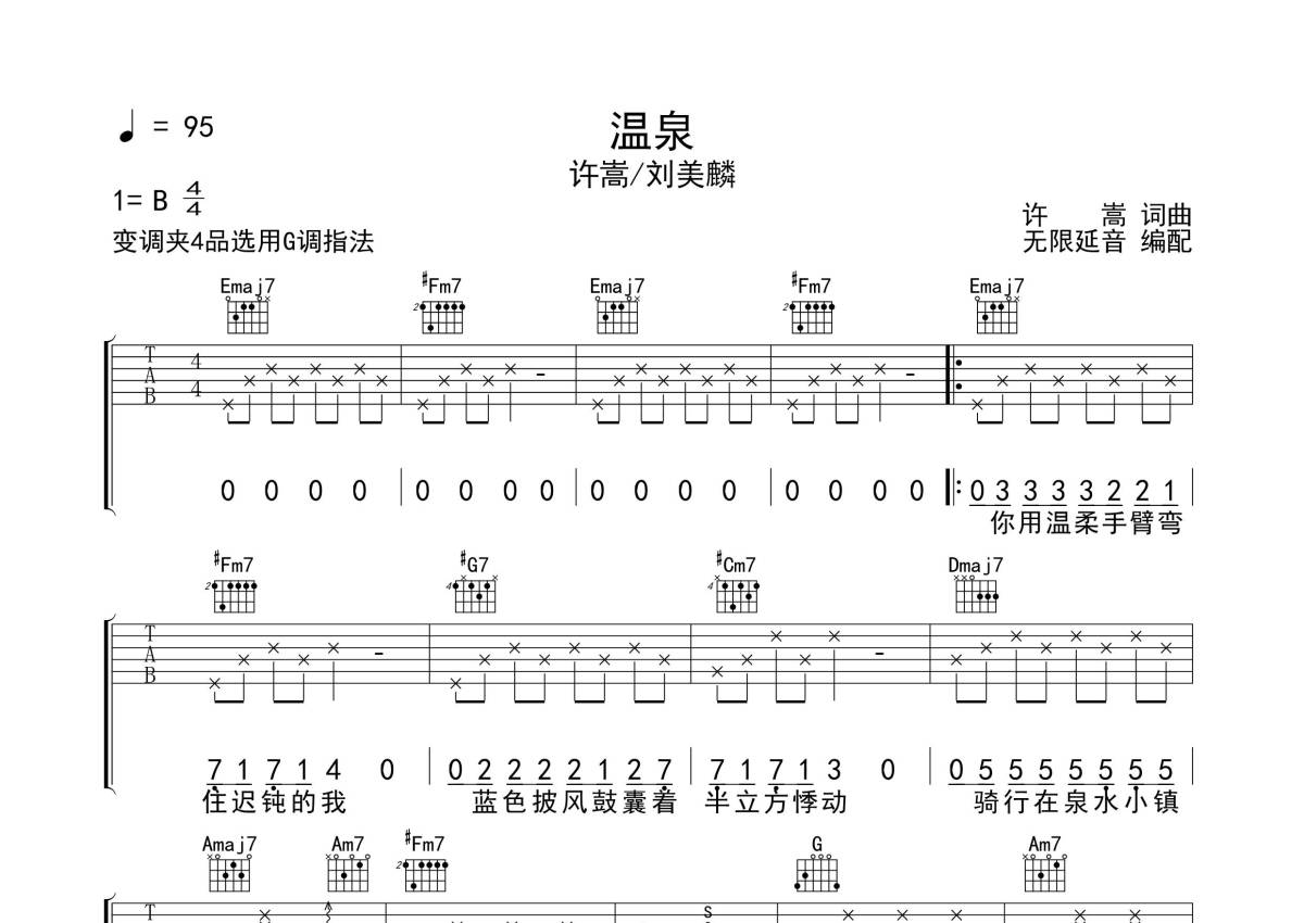 《温泉》是许嵩&刘美麟演唱的一首歌曲,拍号为4/4拍,歌曲速度为每分钟95拍,歌曲原调为B调,但由于原调指法比较难,为了方便弹奏,本吉他谱采用的是G调指法编配,变调夹4品弹奏即为原调,当然也可以根据自己的音域改变变调夹位置,或者通过改变和弦调性,以方便自己弹奏,这份吉他谱共有三张高清图谱,图谱由 @无限延音 编配上传,图谱使用六线谱编配,包含吉他和弦指法、简谱以及歌词部分,使用这份温泉吉他谱,可以让你更加方便地掌握这首歌曲的弹唱技巧,快来尝试吧。