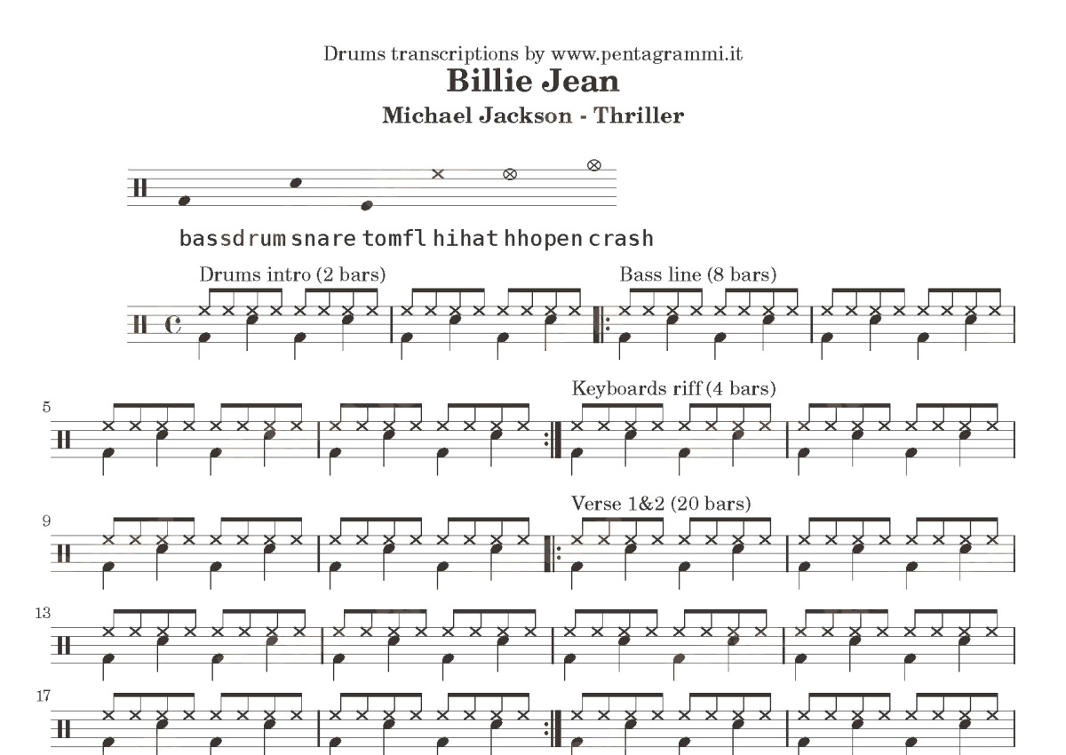 《Billie Jean》是Michael Jackson演唱的一首歌曲,这份鼓谱共有两张高清图谱,图谱由 @打鼓谱 编配上传,图谱使用五线谱编配,使用这份Billie Jean架子鼓谱,你将能够轻松地敲打出这首Michael Jackson的Billie Jean,快来尝试吧。首张收录专辑: 颤栗
