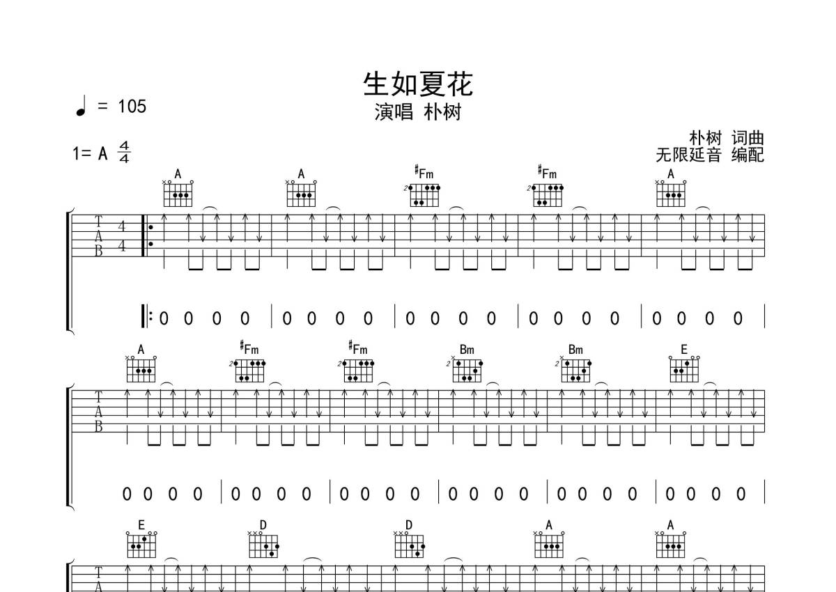 朴树《生如夏花》吉他谱 - A调弹唱六线谱