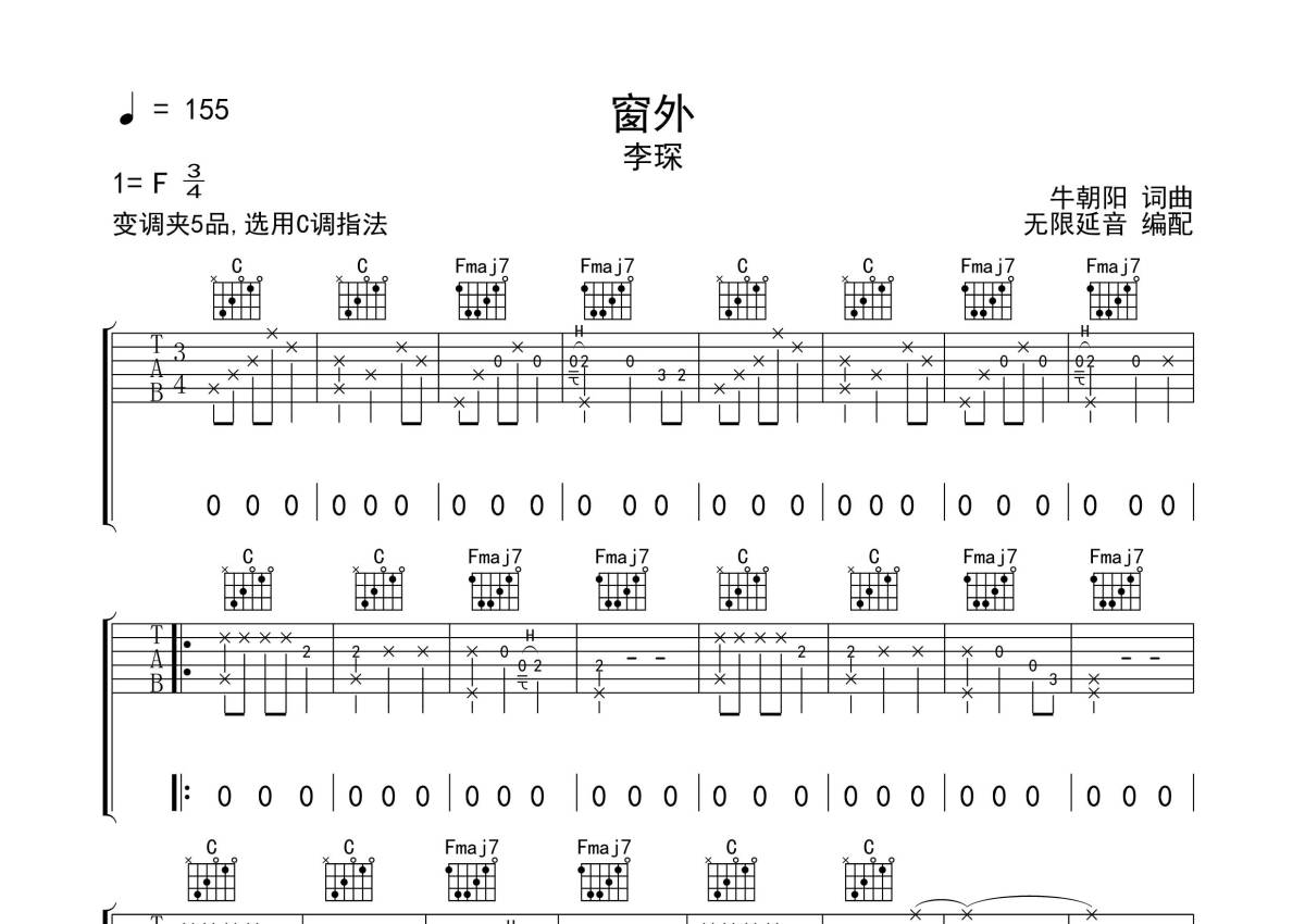 《窗外》是李琛演唱的一首歌曲,拍号为3/4拍,歌曲速度为每分钟155拍,歌曲原调为F调,但由于原调指法比较难,为了方便弹奏,本吉他谱采用的是C调指法编配,变调夹5品弹奏即为原调,当然也可以根据自己的音域改变变调夹位置,或者通过改变和弦调性,以方便自己弹奏,这份吉他谱共有三张高清图谱,图谱由 @无限延音 编配上传,图谱使用六线谱编配,包含吉他和弦指法、简谱以及歌词部分,使用这份窗外吉他谱,可以让你更加方便地掌握这首歌曲的弹唱技巧,快来尝试吧。