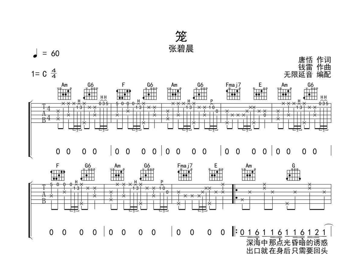 《笼》是张碧晨演唱的一首歌曲,拍号为4/4拍,本吉他谱采用的是C调指法编配,这份吉他谱共有三张高清图谱,图谱由 @无限延音 编配上传,图谱使用六线谱编配,包含吉他和弦指法、简谱以及歌词部分,使用这份笼吉他谱,可以让你更加方便地掌握这首歌曲的弹唱技巧,快来尝试吧。