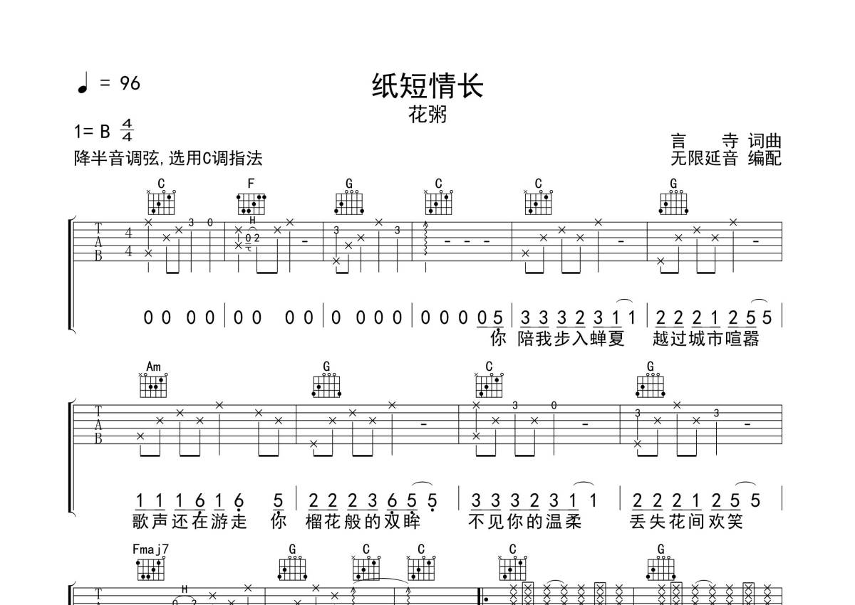 花粥《纸短情长》吉他谱 - C调弹唱六线谱
