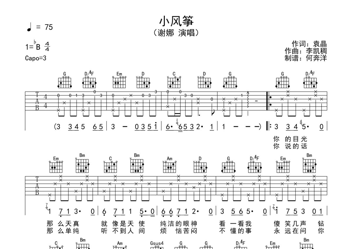 《小风筝》是谢娜演唱的一首歌曲,本吉他谱采用的是G调指法编配,这份吉他谱共有两张高清图谱,图谱由 @何奔洋 编配上传,图谱使用六线谱编配,包含吉他和弦指法、简谱以及歌词部分,曲谱配备了相关的音频提供试听,使用这份小风筝吉他谱,可以让你更加方便地掌握这首歌曲的弹唱技巧,快来尝试吧。谢娜《小风筝》吉他谱_G调吉他弹唱谱。