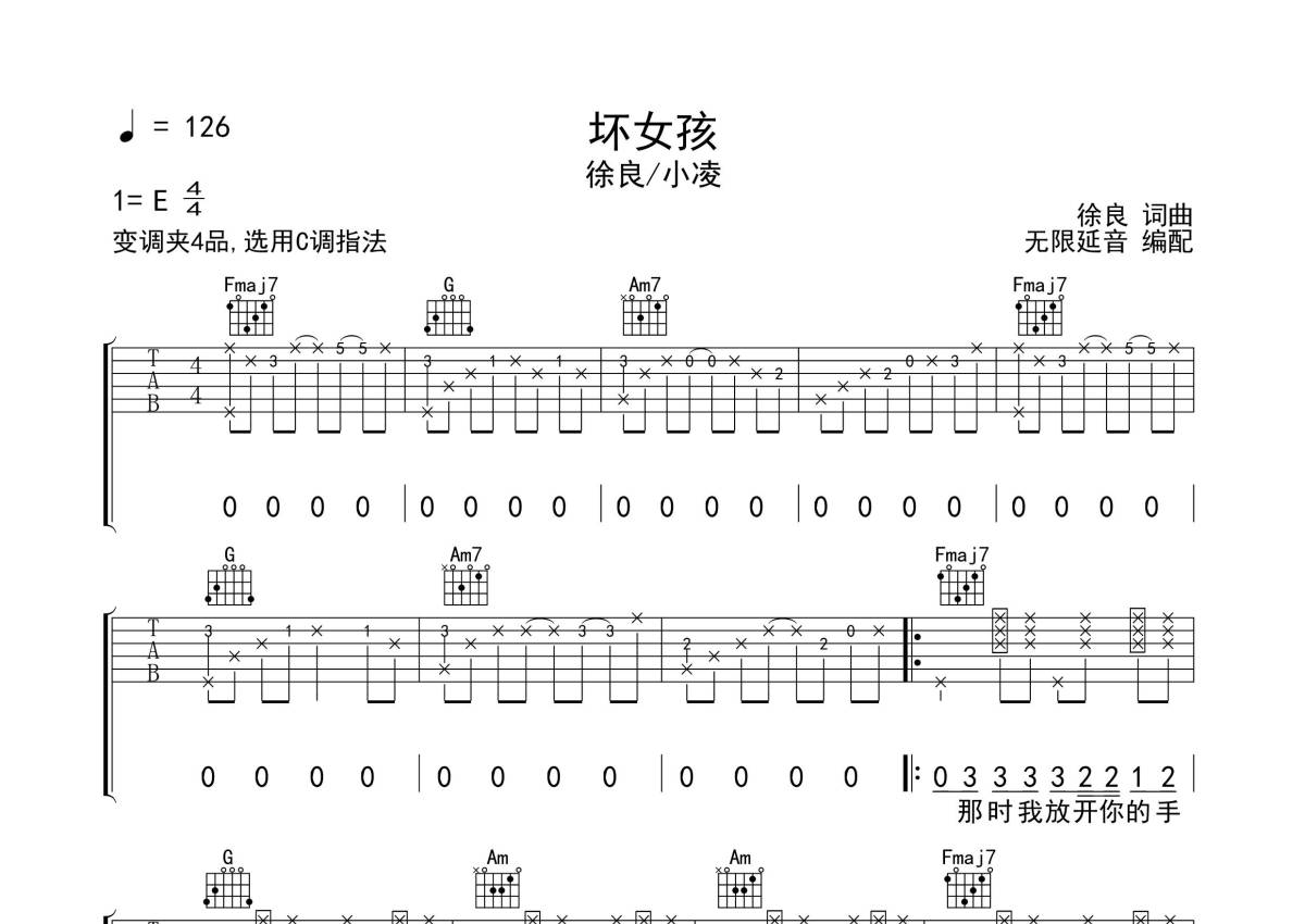 《坏女孩》是徐良、小凌演唱的一首歌曲,拍号为4/4拍,歌曲速度为每分钟126拍,歌曲原调为E调,但由于原调指法比较难,为了方便弹奏,本吉他谱采用的是C调指法编配,变调夹4品弹奏即为原调,当然也可以根据自己的音域改变变调夹位置,或者通过改变和弦调性,以方便自己弹奏,这份吉他谱共有三张高清图谱,图谱由 @无限延音 编配上传,图谱使用六线谱编配,包含吉他和弦指法、简谱以及歌词部分,使用这份坏女孩吉他谱,可以让你更加方便地掌握这首歌曲的弹唱技巧,快来尝试吧。