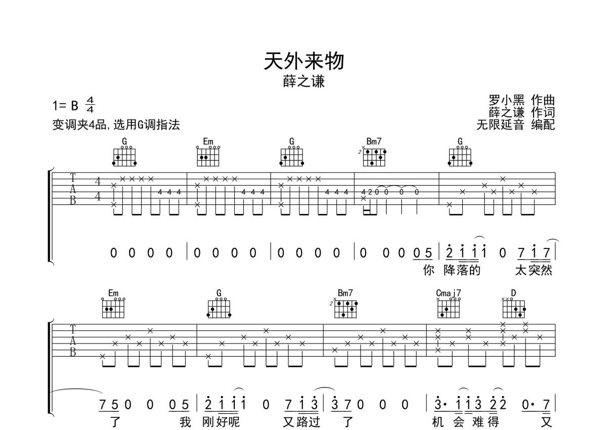 《天外来物》是薛之谦演唱的一首歌曲,拍号为4/4拍,歌曲原调为B调,但由于原调指法比较难,为了方便弹奏,本吉他谱采用的是G调指法编配,变调夹4品弹奏即为原调,当然也可以根据自己的音域改变变调夹位置,或者通过改变和弦调性,以方便自己弹奏,这份吉他谱共有三张高清图谱,图谱由 @无限延音 编配上传,图谱使用六线谱编配,包含吉他和弦指法、简谱以及歌词部分,使用这份天外来物吉他谱,可以让你更加方便地掌握这首歌曲的弹唱技巧,快来尝试吧。
