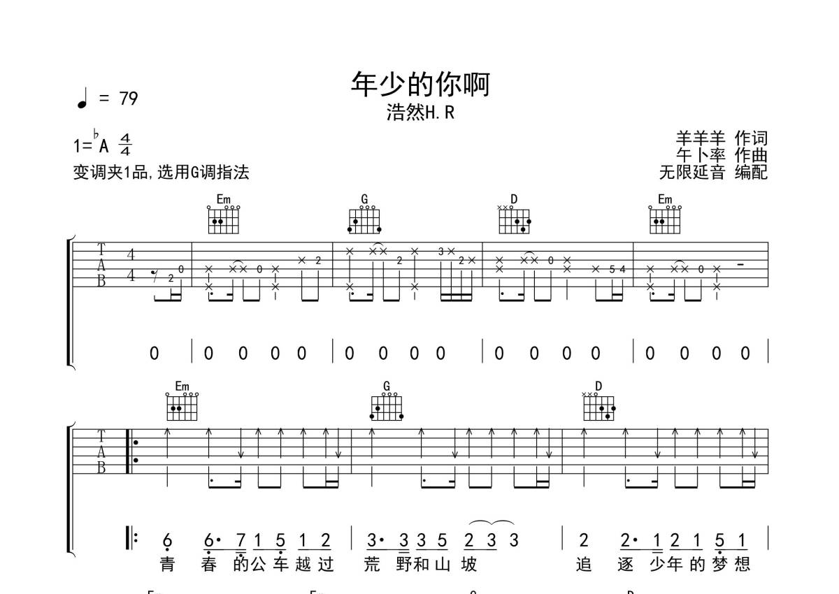 浩然H.R《年少的你啊》吉他谱 - G调弹唱六线谱