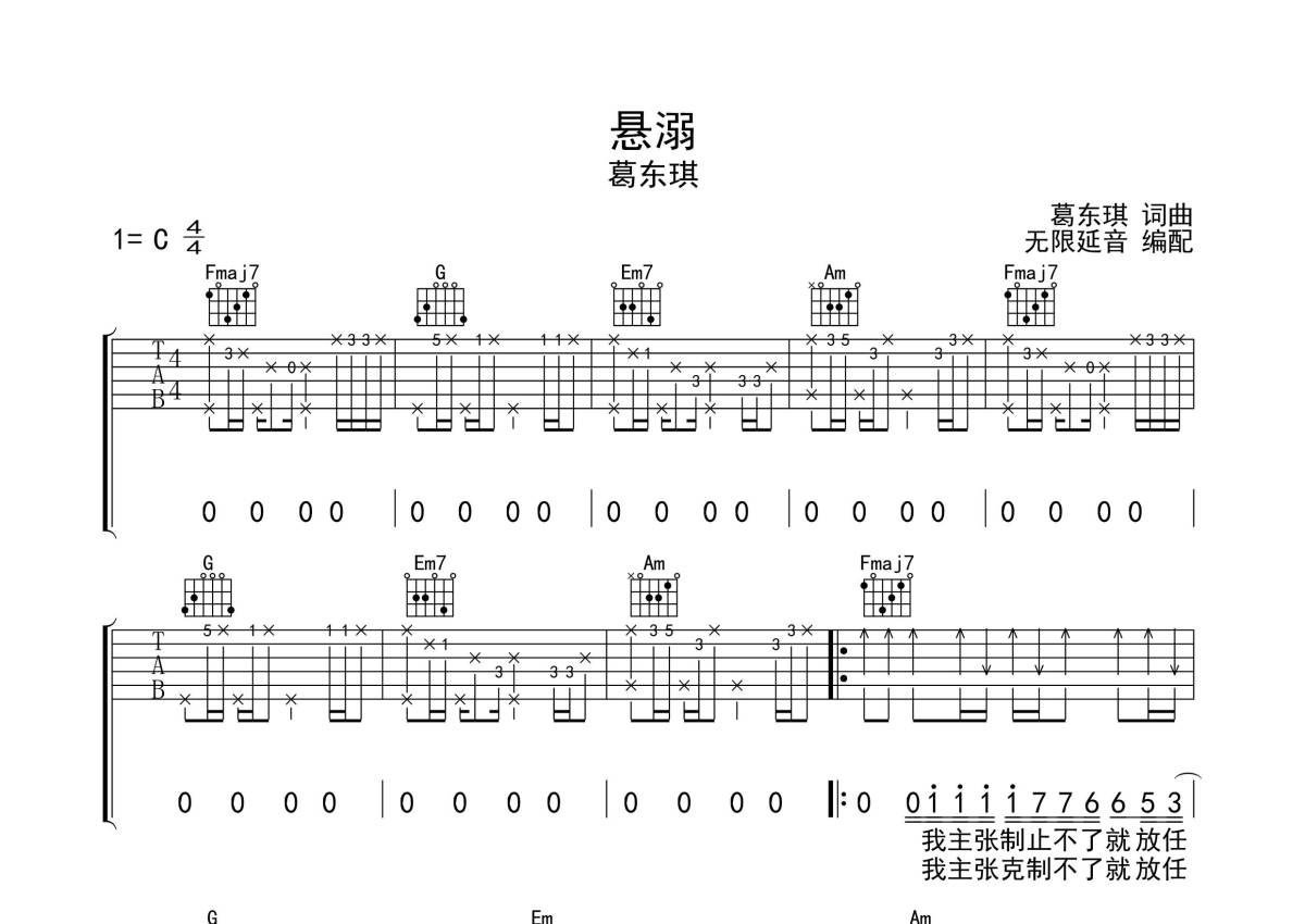 葛东琪《悬溺》吉他谱 - C调弹唱六线谱