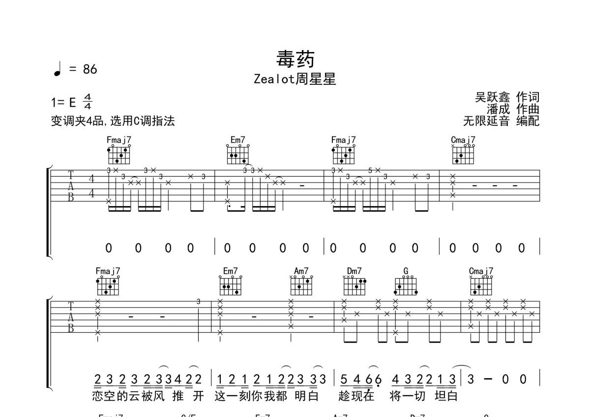 Zea lot 周星星《毒药》吉他谱 - C调弹唱六线谱