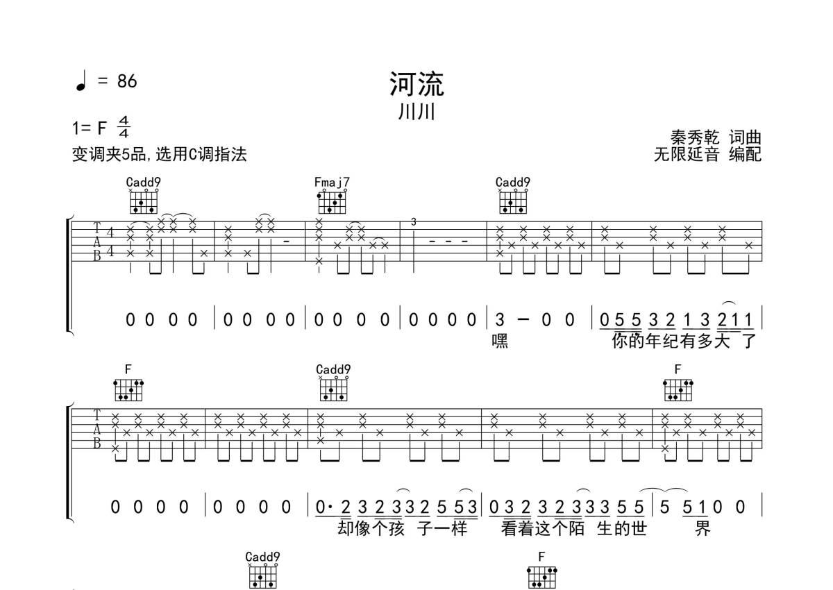 川川《河流》吉他谱 - C调弹唱六线谱