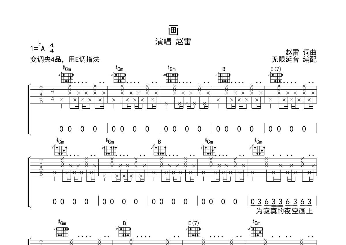 《画》是赵雷演唱的一首歌曲,拍号为4/4拍,歌曲原调为Ab调,但由于原调指法比较难,为了方便弹奏,本吉他谱采用的是E调指法编配,变调夹4品弹奏即为原调,当然也可以根据自己的音域改变变调夹位置,或者通过改变和弦调性,以方便自己弹奏,这份吉他谱共有三张高清图谱,图谱由 @无限延音 编配上传,图谱使用六线谱编配,包含吉他和弦指法、简谱以及歌词部分,使用这份画吉他谱,可以让你更加方便地掌握这首歌曲的弹唱技巧,快来尝试吧。