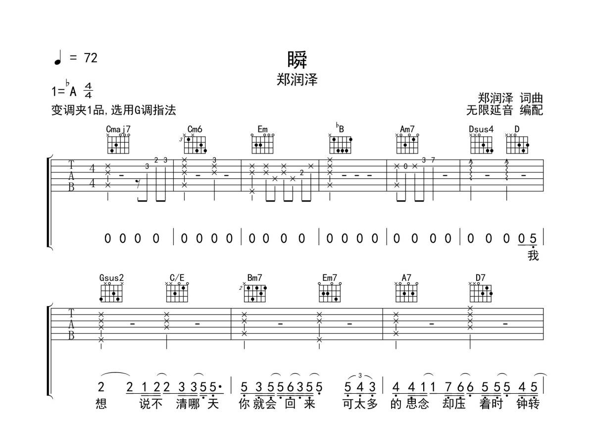 郑润泽《瞬》吉他谱 - G调弹唱六线谱