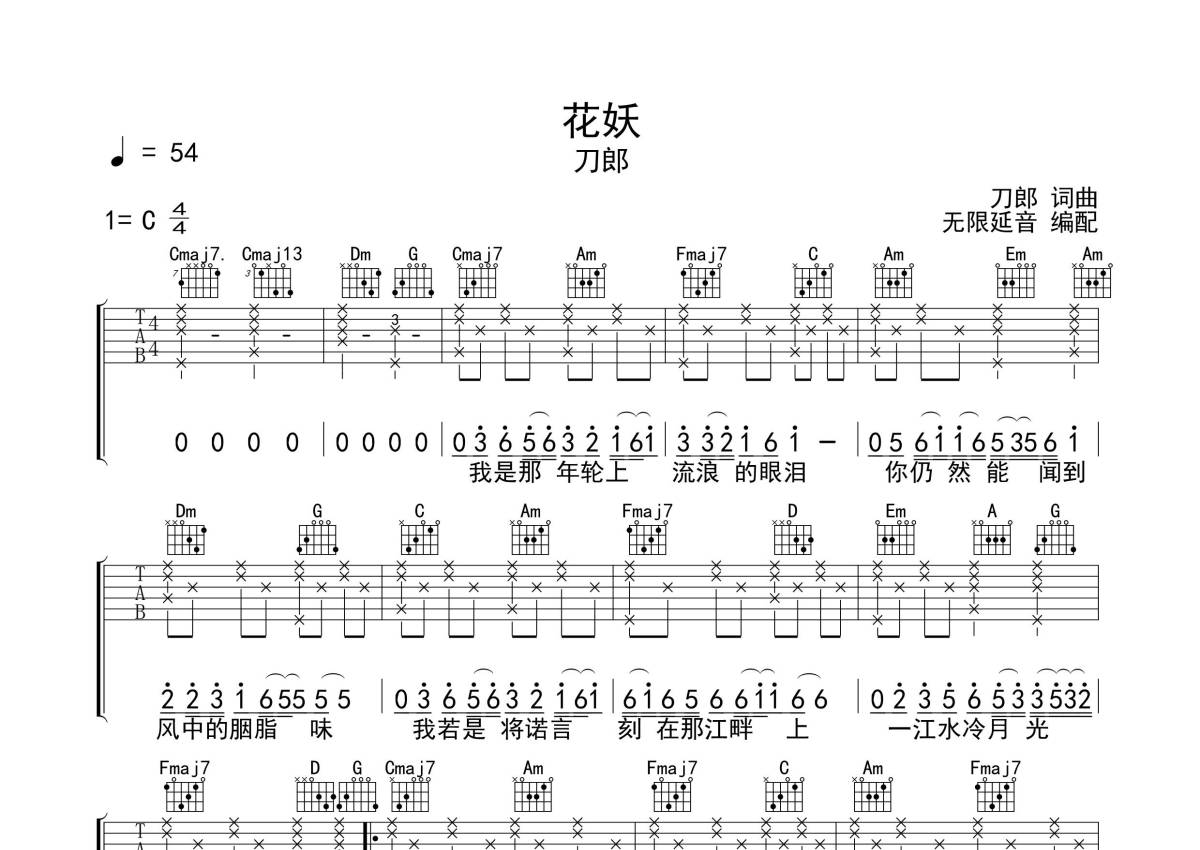 《花妖》是刀郎演唱的一首歌曲,拍号为4/4拍,歌曲速度为每分钟54拍,本吉他谱采用的是C调指法编配,这份吉他谱共有两张高清图谱,图谱由 @无限延音 编配上传,图谱使用六线谱编配,包含吉他和弦指法、简谱以及歌词部分,使用这份花妖吉他谱,可以让你更加方便地掌握这首歌曲的弹唱技巧,快来尝试吧。