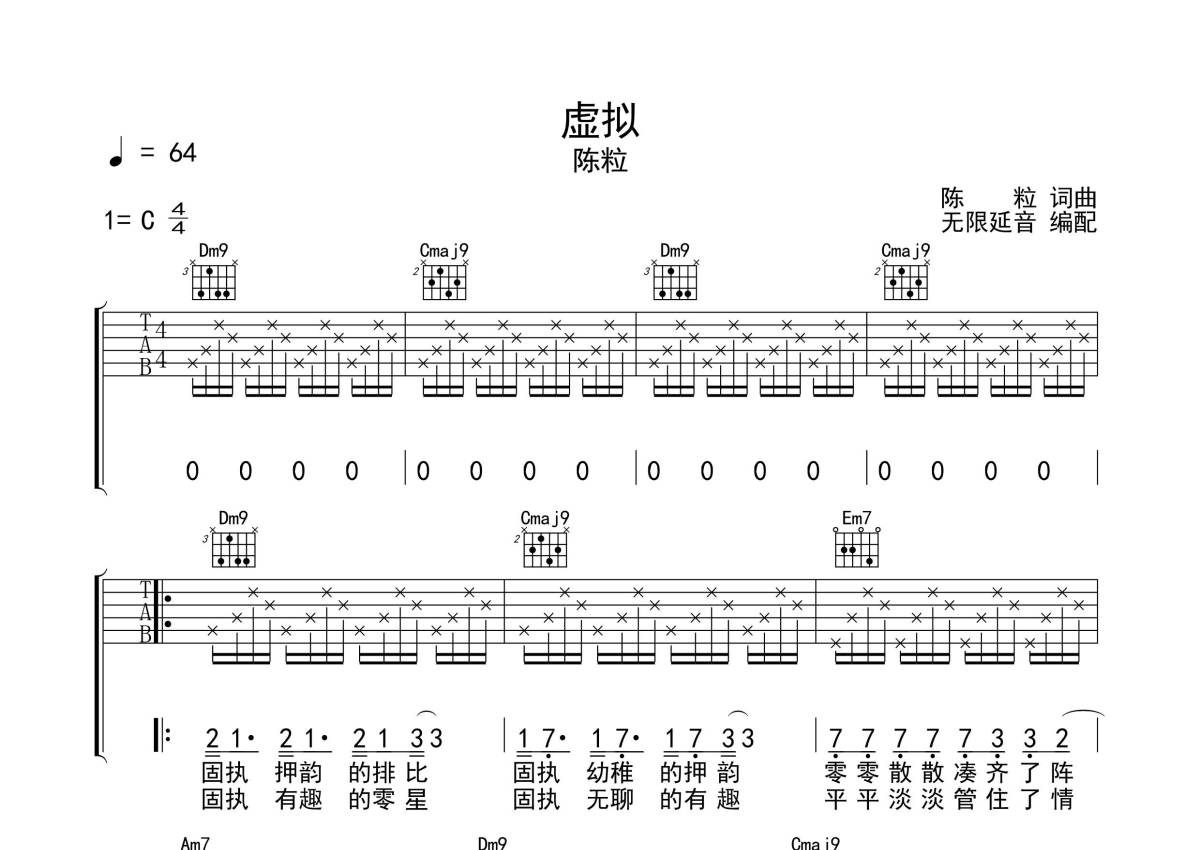 《虚拟》是陈粒演唱的一首歌曲,拍号为4/4拍,歌曲速度为每分钟64拍,本吉他谱采用的是C调指法编配,这份吉他谱共有两张高清图谱,图谱由 @无限延音 编配上传,图谱使用六线谱编配,包含吉他和弦指法、简谱以及歌词部分,使用这份虚拟吉他谱,可以让你更加方便地掌握这首歌曲的弹唱技巧,快来尝试吧。