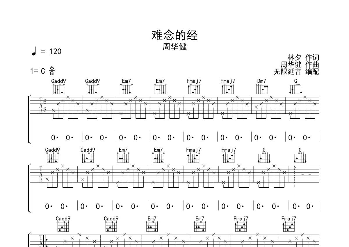 《难念的经》是周华健演唱的一首歌曲,拍号为6/8拍,歌曲速度为每分钟120拍,歌曲原调为C调,本吉他谱采用的是C调指法编配,演奏时不需要使用变调夹即为原调,这份吉他谱共有三张高清图谱,图谱由 @无限延音 编配上传,图谱使用六线谱编配,包含吉他和弦指法、简谱以及歌词部分,使用这份难念的经吉他谱,可以让你更加方便地掌握这首歌曲的弹唱技巧,快来尝试吧。