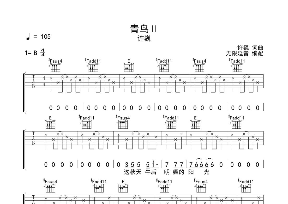 《青鸟Ⅱ》是许巍演唱的一首歌曲,拍号为4/4拍,歌曲原调为B调,但由于原调指法比较难,为了方便弹奏,本吉他谱采用的是B调指法编配,演奏时不需要使用变调夹即为原调,这份吉他谱共有三张高清图谱,图谱由 @无限延音 编配上传,图谱使用六线谱编配,包含吉他和弦指法、简谱以及歌词部分,使用这份青鸟Ⅱ吉他谱,可以让你更加方便地掌握这首歌曲的弹唱技巧,快来尝试吧。