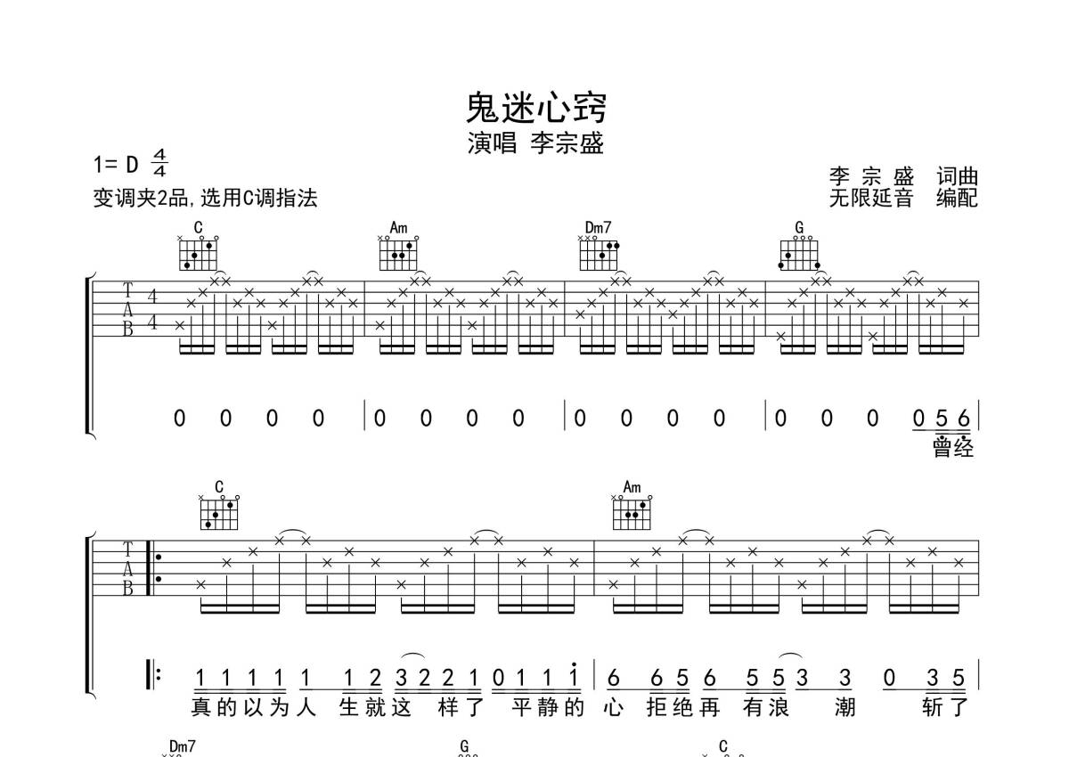 《鬼迷心窍》是李宗盛演唱的一首歌曲,拍号为4/4拍,歌曲原调为D调,但由于原调指法比较难,为了方便弹奏,本吉他谱采用的是C调指法编配,变调夹2品弹奏即为原调,当然也可以根据自己的音域改变变调夹位置,或者通过改变和弦调性,以方便自己弹奏,这份吉他谱共有两张高清图谱,图谱由 @无限延音 编配上传,图谱使用六线谱编配,包含吉他和弦指法、简谱以及歌词部分,使用这份鬼迷心窍吉他谱,可以让你更加方便地掌握这首歌曲的弹唱技巧,快来尝试吧。