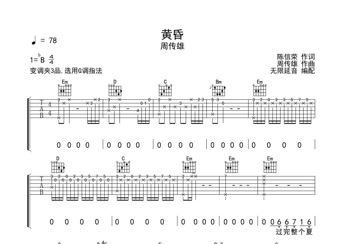 《黄昏》是周传雄演唱的一首歌曲,拍号为4/4拍,歌曲速度为每分钟78拍,歌曲原调为Bb调,但由于原调指法比较难,为了方便弹奏,本吉他谱采用的是G调指法编配,变调夹3品弹奏即为原调,当然也可以根据自己的音域改变变调夹位置,或者通过改变和弦调性,以方便自己弹奏,这份吉他谱共有三张高清图谱,图谱由 @无限延音 编配上传,图谱使用六线谱编配,包含吉他和弦指法、简谱以及歌词部分,使用这份黄昏吉他谱,可以让你更加方便地掌握这首歌曲的弹唱技巧,快来尝试吧。