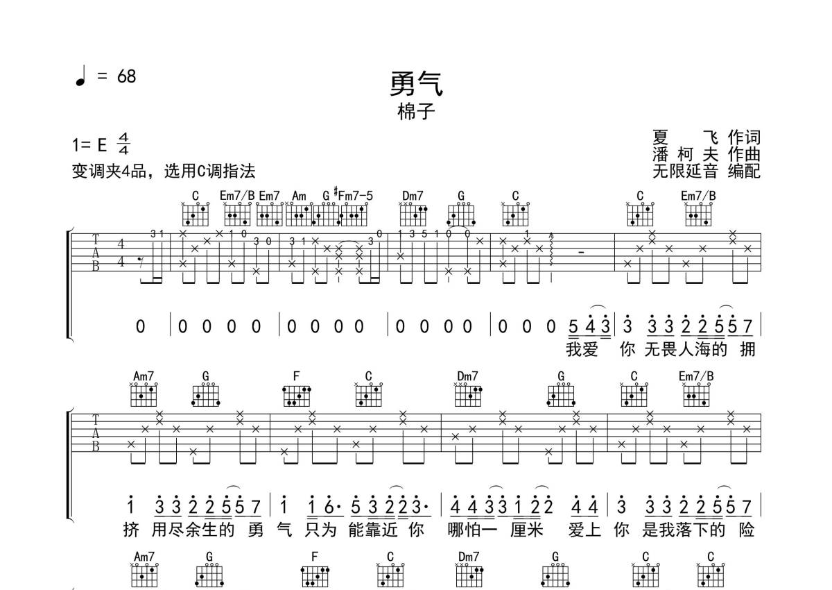 《勇气》是棉子演唱的一首歌曲,拍号为4/4拍,歌曲速度为每分钟68拍,歌曲原调为E调,但由于原调指法比较难,为了方便弹奏,本吉他谱采用的是C调指法编配,变调夹4品弹奏即为原调,当然也可以根据自己的音域改变变调夹位置,或者通过改变和弦调性,以方便自己弹奏,这份吉他谱共有两张高清图谱,图谱由 @无限延音 编配上传,图谱使用六线谱编配,包含吉他和弦指法、简谱以及歌词部分,使用这份勇气吉他谱,可以让你更加方便地掌握这首歌曲的弹唱技巧,快来尝试吧。