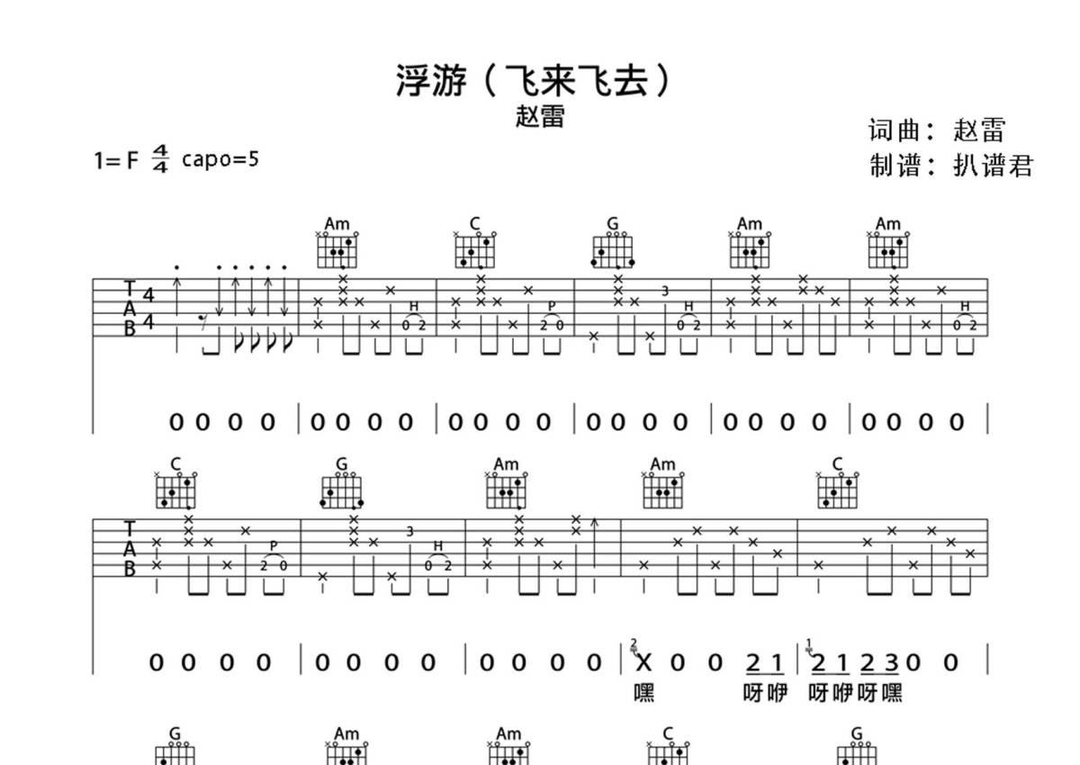 赵雷《浮游》吉他谱 - F调弹唱六线谱
