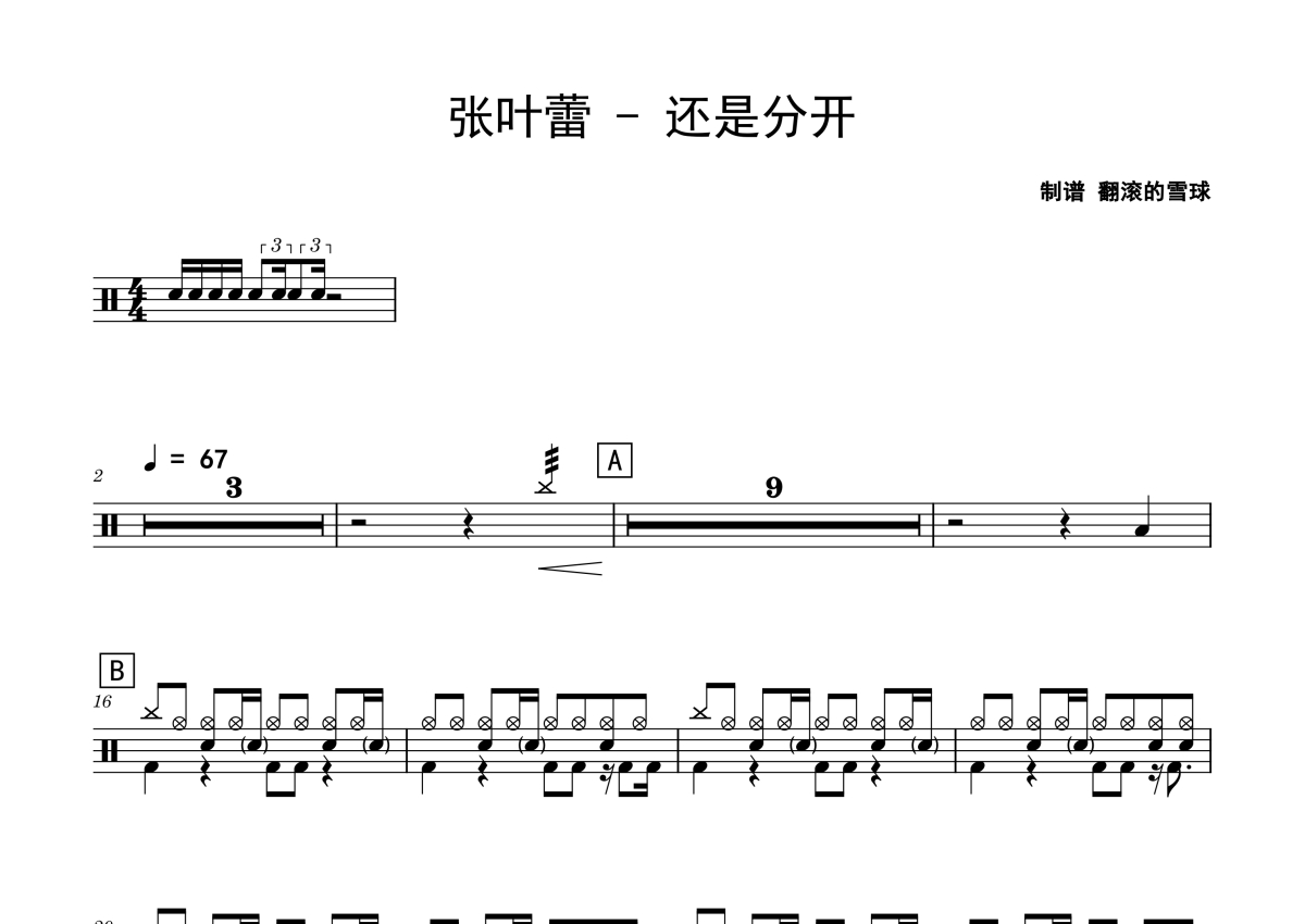 《还是分开》是张叶蕾演唱的一首歌曲,拍号为4/4拍,歌曲速度为每分钟67拍,这份鼓谱共有两张高清图谱,图谱由 @老虎不说谎 编配上传,图谱使用五线谱编配,使用这份还是分开架子鼓谱,你将能够轻松地敲打出这首张叶蕾的还是分开,快来尝试吧。