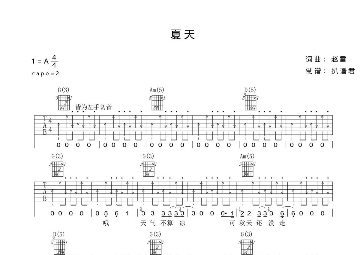赵雷《夏天》吉他谱 - A调弹唱六线谱