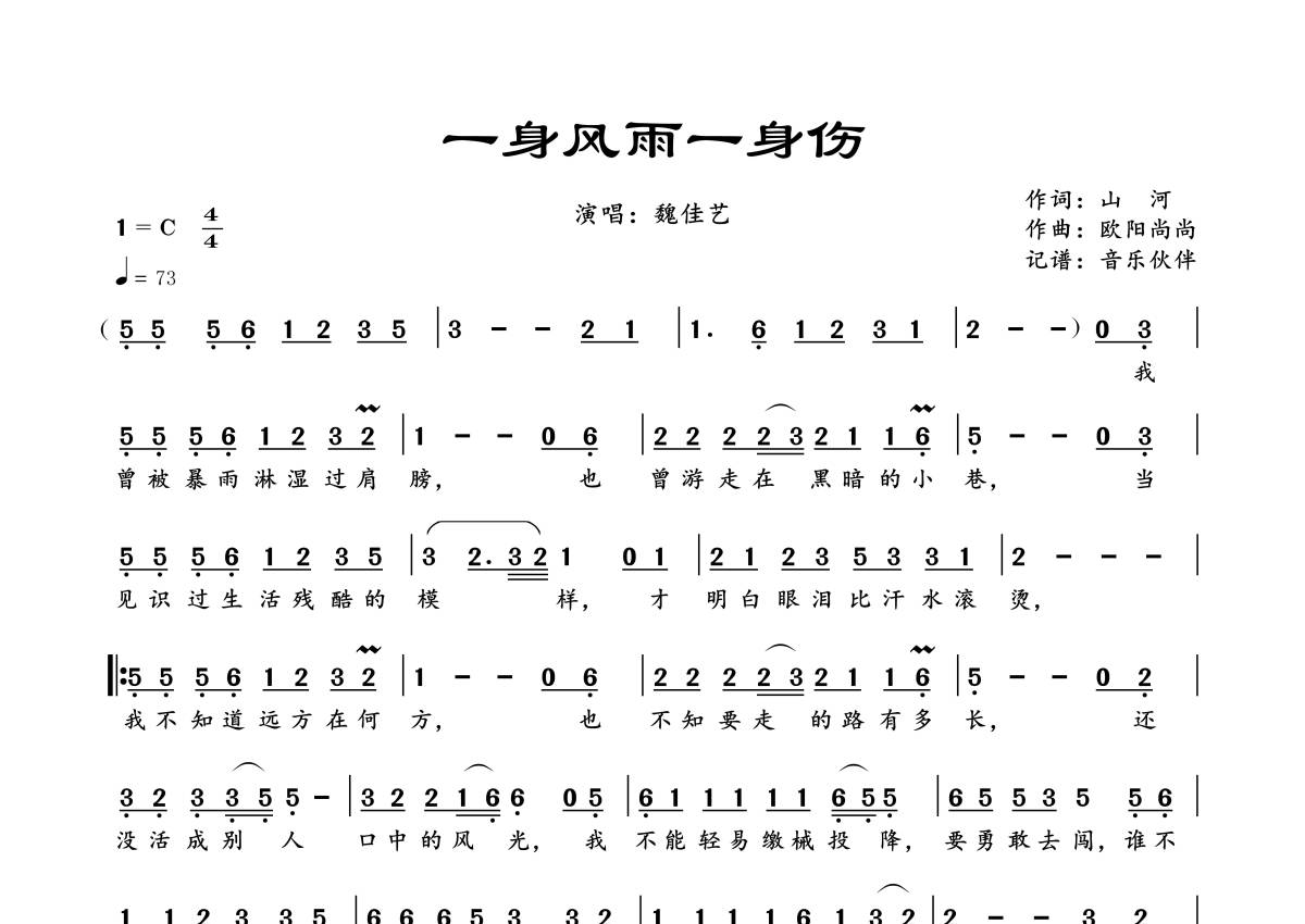 《一身风雨一身伤》是魏佳艺演唱的一首歌曲,拍号为4/4拍,歌曲速度为每分钟73拍,这份简谱共有一张高清图谱,图谱由 @音乐伙伴 编配上传。