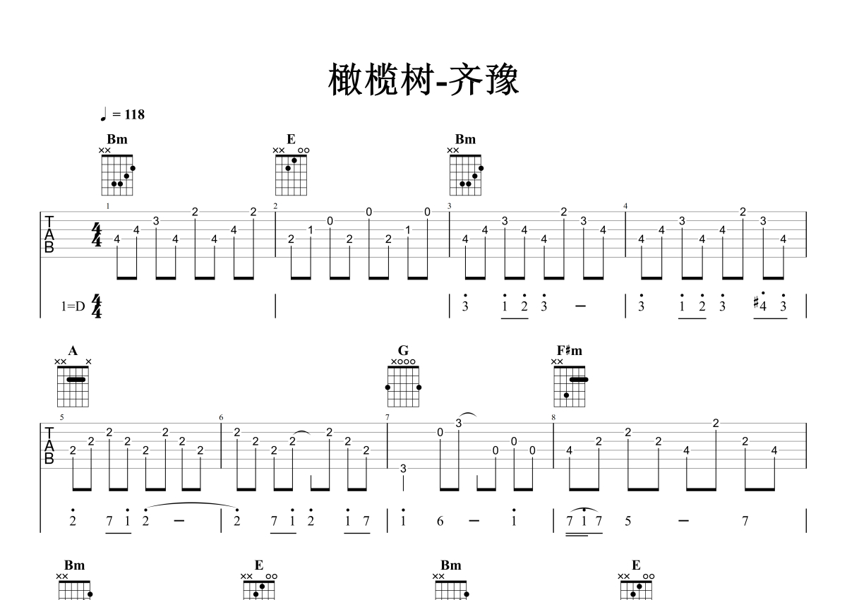 《橄榄树》是齐豫演唱的一首歌曲,石头音乐原版记谱,拍号为4/4拍,歌曲速度为每分钟118拍,歌曲原调为D调,但由于原调指法比较难,为了方便弹奏,本吉他谱采用的是D调指法编配,演奏时不需要使用变调夹即为原调,这份吉他谱共有六张高清图谱,图谱由 @石头音乐 编配上传,图谱使用六线谱编配,包含吉他和弦指法、简谱以及歌词部分,曲谱配备了相关的音频提供试听,使用这份橄榄树吉他谱,可以让你更加方便地掌握这首歌曲的弹唱技巧,快来尝试吧。