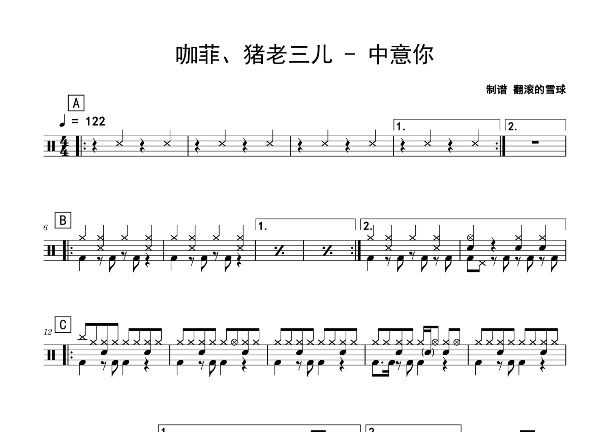 咖菲/猪老三儿《中意你》鼓谱 - 架子鼓谱
