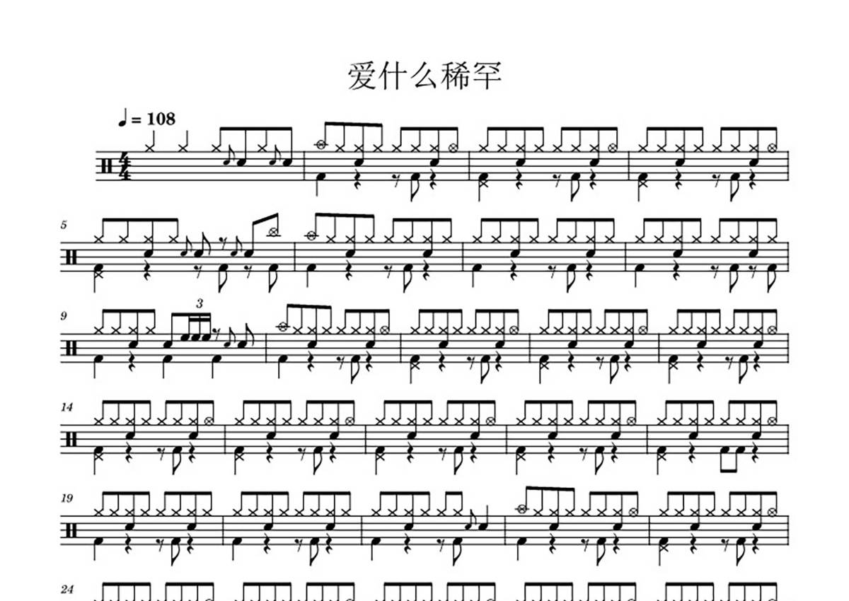 《爱什么稀罕》是张惠妹演唱的一首歌曲,拍号为4/4拍,歌曲速度为每分钟108拍,这份鼓谱共有三张高清图谱,图谱由 @鼓手清风 编配上传,图谱使用五线谱编配,使用这份爱什么稀罕架子鼓谱,你将能够轻松地敲打出这首张惠妹的爱什么稀罕,快来尝试吧。鼓谱-爱什么稀罕,张惠妹经典歌曲之一。