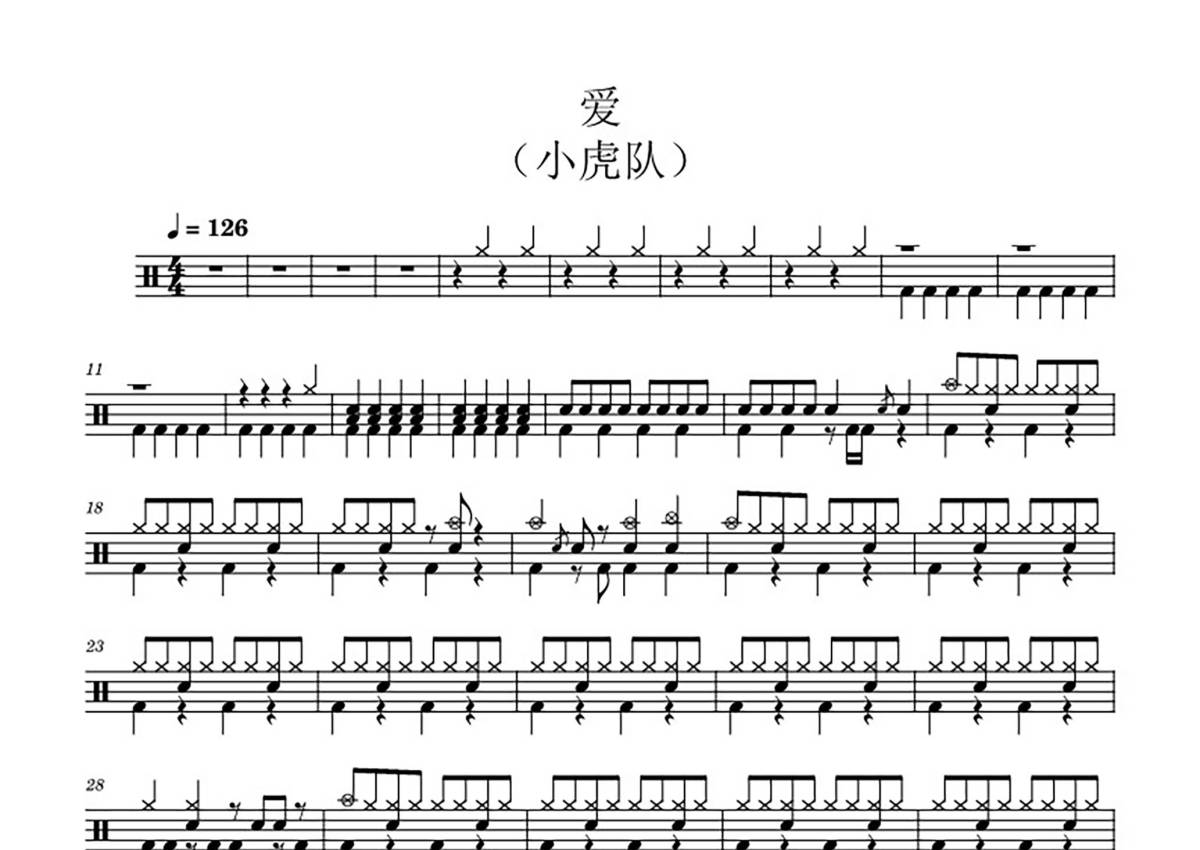 《爱》是小虎队演唱的一首歌曲,拍号为4/4拍,歌曲速度为每分钟126拍,这份鼓谱共有三张高清图谱,图谱由 @鼓手清风 编配上传,图谱使用五线谱编配,使用这份爱架子鼓谱,你将能够轻松地敲打出这首小虎队的爱,快来尝试吧。爱-小虎队经典曲目,经久不衰,适合孩子们演出。