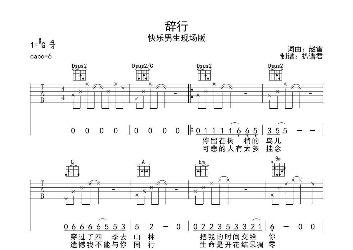 赵雷《辞行》吉他谱 - D调弹唱六线谱 - 快乐男声现场版