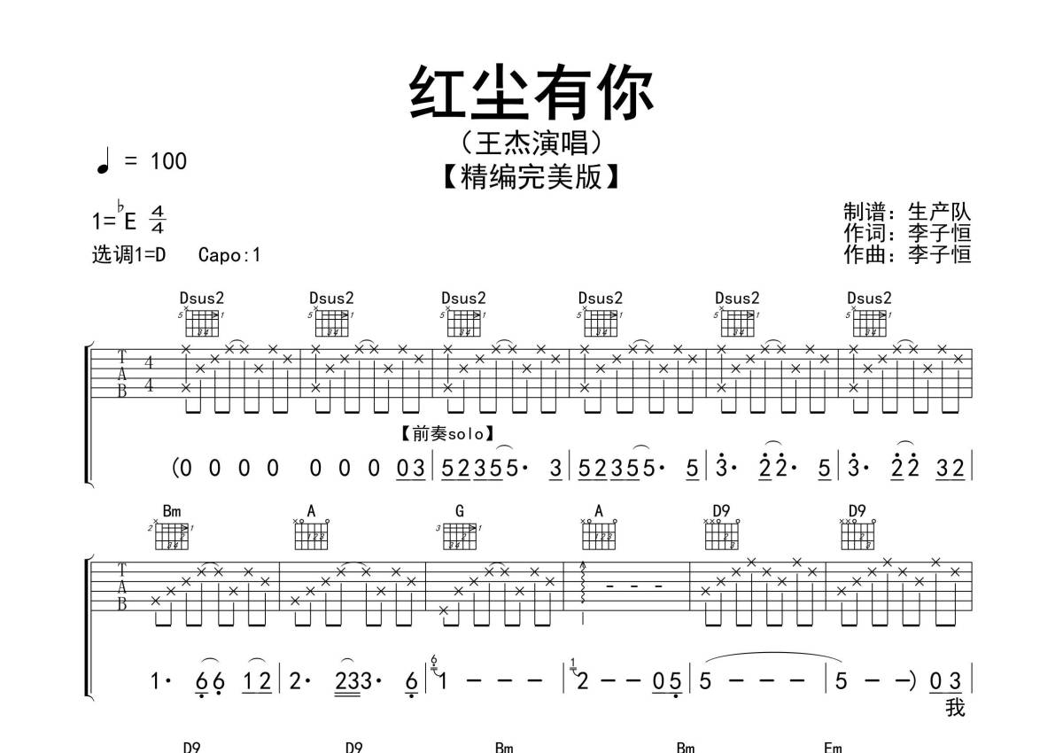 《红尘有你》是王杰演唱的一首歌曲,精编完美版,拍号为4/4拍,歌曲速度为每分钟100拍,歌曲原调为Eb调,但由于原调指法比较难,为了方便弹奏,本吉他谱采用的是D调指法编配,变调夹1品弹奏即为原调,当然也可以根据自己的音域改变变调夹位置,或者通过改变和弦调性,以方便自己弹奏,这份吉他谱共有三张高清图谱,图谱由 @生产队 编配上传,图谱使用六线谱编配,包含吉他和弦指法、简谱以及歌词部分,使用这份红尘有你吉他谱,可以让你更加方便地掌握这首歌曲的弹唱技巧,快来尝试吧。《红尘有你》是一首由李子恒作词、作曲,Iskandar Ismail编曲,并由王杰演唱的歌曲,《红尘有你》是电影《战龙在野》电影插曲,也是电视剧《刘伯温传奇》主题曲。本吉他谱根据D调指法编配,完整的前奏、间奏、尾奏和SOLO编配,精编一音不差版,致敬经典!。