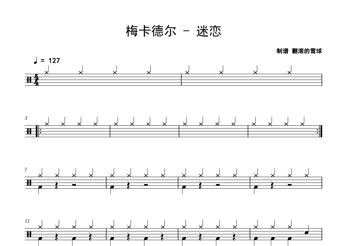 《迷恋》是梅卡德尔演唱的一首歌曲,拍号为4/4拍,歌曲速度为每分钟127拍,这份鼓谱共有四张高清图谱,图谱由 @老虎不说谎 编配上传,图谱使用五线谱编配,使用这份迷恋架子鼓谱,你将能够轻松地敲打出这首梅卡德尔的迷恋,快来尝试吧。