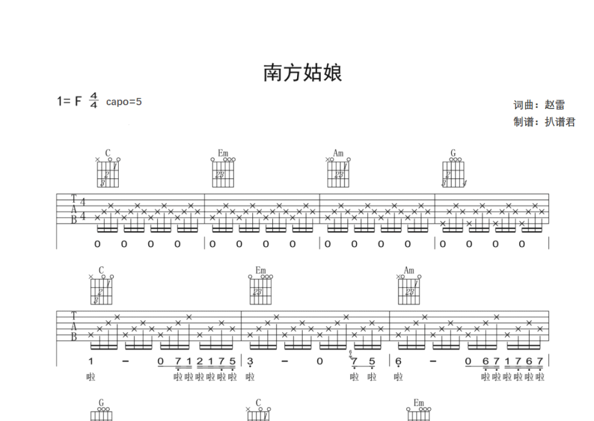 赵雷《南方姑娘》吉他谱 - C调弹唱六线谱