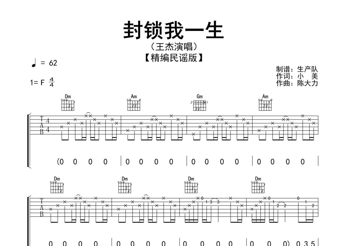 《封锁我一生》是王杰演唱的一首歌曲,精编民谣版,拍号为4/4拍,歌曲速度为每分钟62拍,歌曲原调为F调,但由于原调指法比较难,为了方便弹奏,本吉他谱采用的是F调指法编配,演奏时不需要使用变调夹即为原调,这份吉他谱共有三张高清图谱,图谱由 @生产队 编配上传,图谱使用六线谱编配,包含吉他和弦指法、简谱以及歌词部分,使用这份封锁我一生吉他谱,可以让你更加方便地掌握这首歌曲的弹唱技巧,快来尝试吧。《封锁我一生》是王杰演唱的一首粤语歌曲,由小美填词,陈大力作曲,Ricky Ho编曲,该曲也是电视剧《大赌场》的主题曲,本吉他谱根据原版F调指法编配,完整的前奏、间奏、尾奏编配,更加适合吉他弹唱的精编民谣版,怀旧经典!。