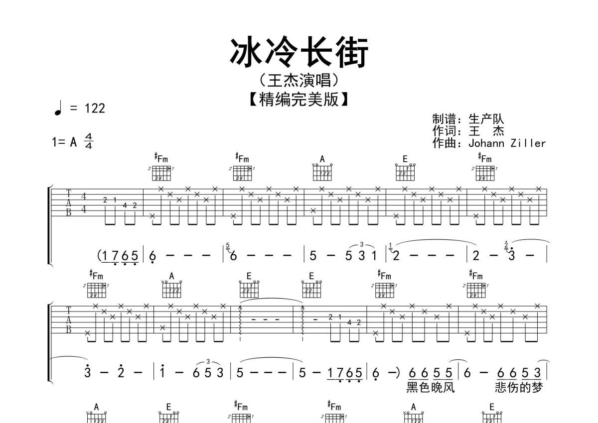《冰冷长街》是王杰演唱的一首歌曲,精编完美版,拍号为4/4拍,歌曲速度为每分钟122拍,歌曲原调为A调,但由于原调指法比较难,为了方便弹奏,本吉他谱采用的是A调指法编配,演奏时不需要使用变调夹即为原调,这份吉他谱共有三张高清图谱,图谱由 @生产队 编配上传,图谱使用六线谱编配,包含吉他和弦指法、简谱以及歌词部分,使用这份冰冷长街吉他谱,可以让你更加方便地掌握这首歌曲的弹唱技巧,快来尝试吧。《冰冷长街》是著名歌手王杰演唱的一首歌曲,由王杰作词,Johann Ziller作曲,Ricky Ho编曲,收录在1991年11月30日《一生心碎》专辑中,该曲也是电影《至尊无上Ⅱ之永霸天下》片尾曲,和电视剧《挞出爱火花》插曲。本吉他谱根据原版A调指法编配,精准的前奏、间奏、尾奏编配,精编一音不差版,致敬经典!。
