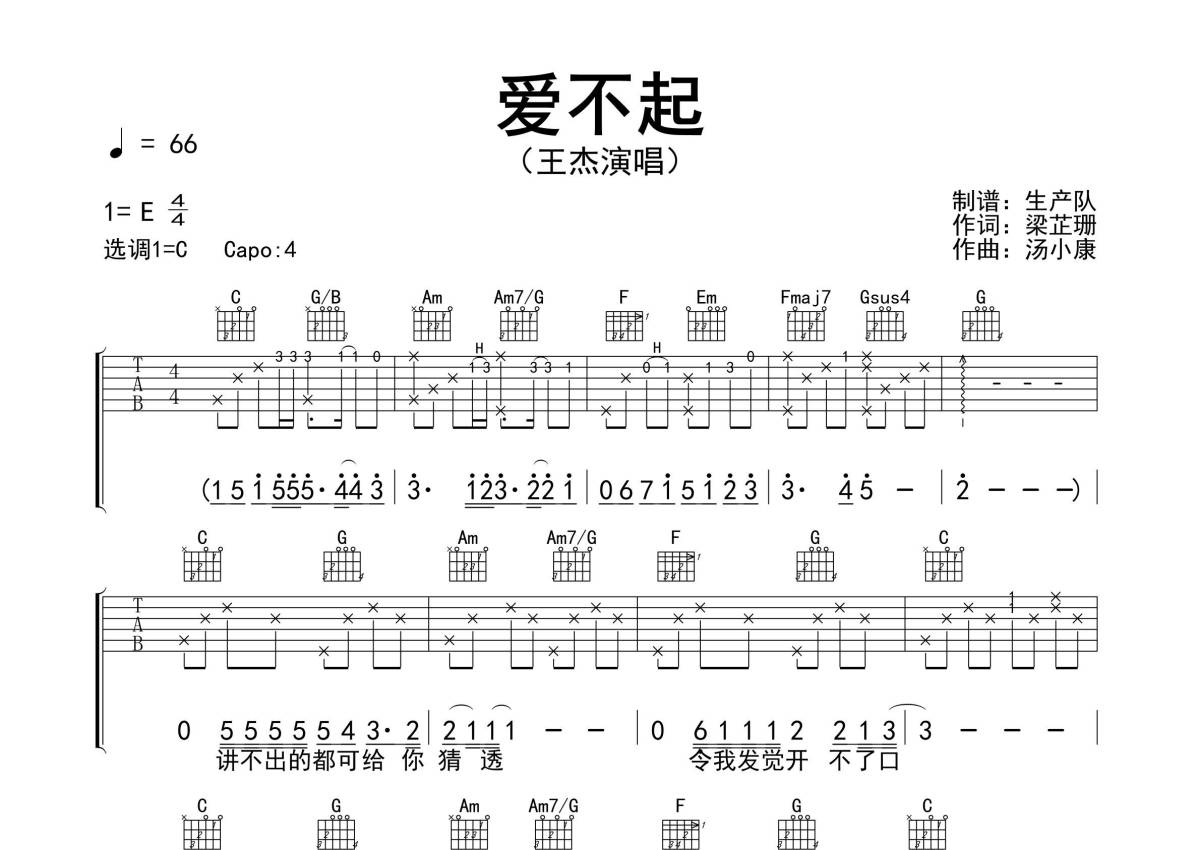 《爱不起》是王杰演唱的一首歌曲,精编民谣版,拍号为4/4拍,歌曲速度为每分钟66拍,歌曲原调为E调,但由于原调指法比较难,为了方便弹奏,本吉他谱采用的是C调指法编配,变调夹4品弹奏即为原调,当然也可以根据自己的音域改变变调夹位置,或者通过改变和弦调性,以方便自己弹奏,这份吉他谱共有三张高清图谱,图谱由 @生产队 编配上传,图谱使用六线谱编配,包含吉他和弦指法、简谱以及歌词部分,使用这份爱不起吉他谱,可以让你更加方便地掌握这首歌曲的弹唱技巧,快来尝试吧。《爱不起》是一首由梁芷珊作词、汤小康作曲,Dave Pickell编曲,王杰演唱的歌曲,收录在粤语专辑《爱与梦》中 ,该曲是电影《这个夏天有异性》的插曲。本吉他谱根据采用C调指法编配,完整的前奏、间奏编配,怀旧经典!。