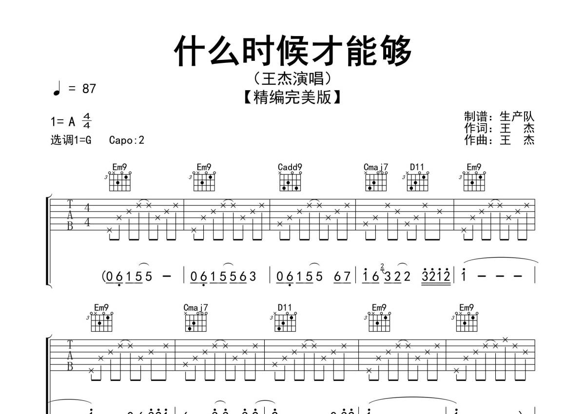 《什么时候才能够》是王杰演唱的一首歌曲,精编完美版,拍号为4/4拍,歌曲速度为每分钟87拍,歌曲原调为A调,但由于原调指法比较难,为了方便弹奏,本吉他谱采用的是G调指法编配,变调夹2品弹奏即为原调,当然也可以根据自己的音域改变变调夹位置,或者通过改变和弦调性,以方便自己弹奏,这份吉他谱共有三张高清图谱,图谱由 @生产队 编配上传,图谱使用六线谱编配,包含吉他和弦指法、简谱以及歌词部分,使用这份什么时候才能够吉他谱,可以让你更加方便地掌握这首歌曲的弹唱技巧,快来尝试吧。《什么时候才能够》由王杰作词、作曲,并演唱,Ricky Ho编曲,收录在国语专辑《我》中。本吉他谱根据原版G调指法编配,精准的前奏、间奏、尾奏和SOLO编配,精编一音不差版,致敬经典!。