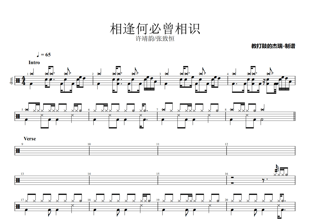 许靖韵/张致恒《相逢何必曾相识》鼓谱 - 架子鼓谱