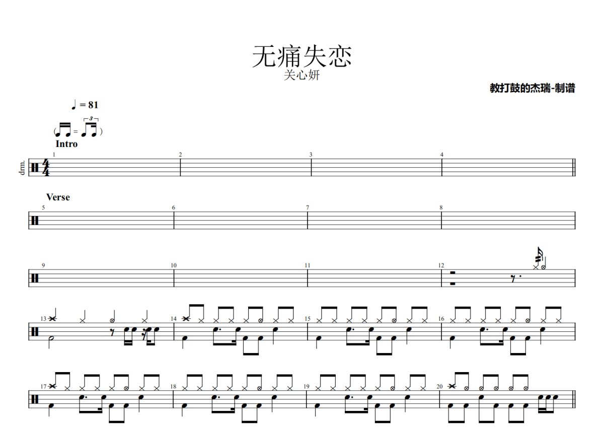 《无痛失恋》是关心妍演唱的一首歌曲,拍号为4/4拍,歌曲速度为每分钟81拍,这份鼓谱共有两张高清图谱,图谱由 @Jerry 编配上传,图谱使用五线谱编配,使用这份无痛失恋架子鼓谱,你将能够轻松地敲打出这首关心妍的无痛失恋,快来尝试吧。
