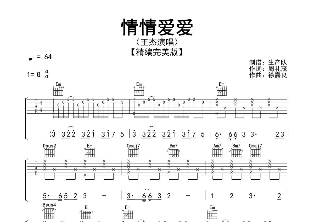 《情情爱爱》是王杰演唱的一首歌曲,精编完美版,拍号为4/4拍,歌曲速度为每分钟64拍,歌曲原调为G调,本吉他谱采用的是G调指法编配,演奏时不需要使用变调夹即为原调,这份吉他谱共有三张高清图谱,图谱由 @生产队 编配上传,图谱使用六线谱编配,包含吉他和弦指法、简谱以及歌词部分,使用这份情情爱爱吉他谱,可以让你更加方便地掌握这首歌曲的弹唱技巧,快来尝试吧。《情情爱爱》是1993年王杰演唱的一首歌曲,由周礼茂作词、徐嘉良作曲,Iskandar Ismail编曲,收录在专辑《她》中。本吉他谱根据原版G调指法编配,精准的前奏、间奏、尾奏和SOLO编配,精编一音不差版,致敬经典!。