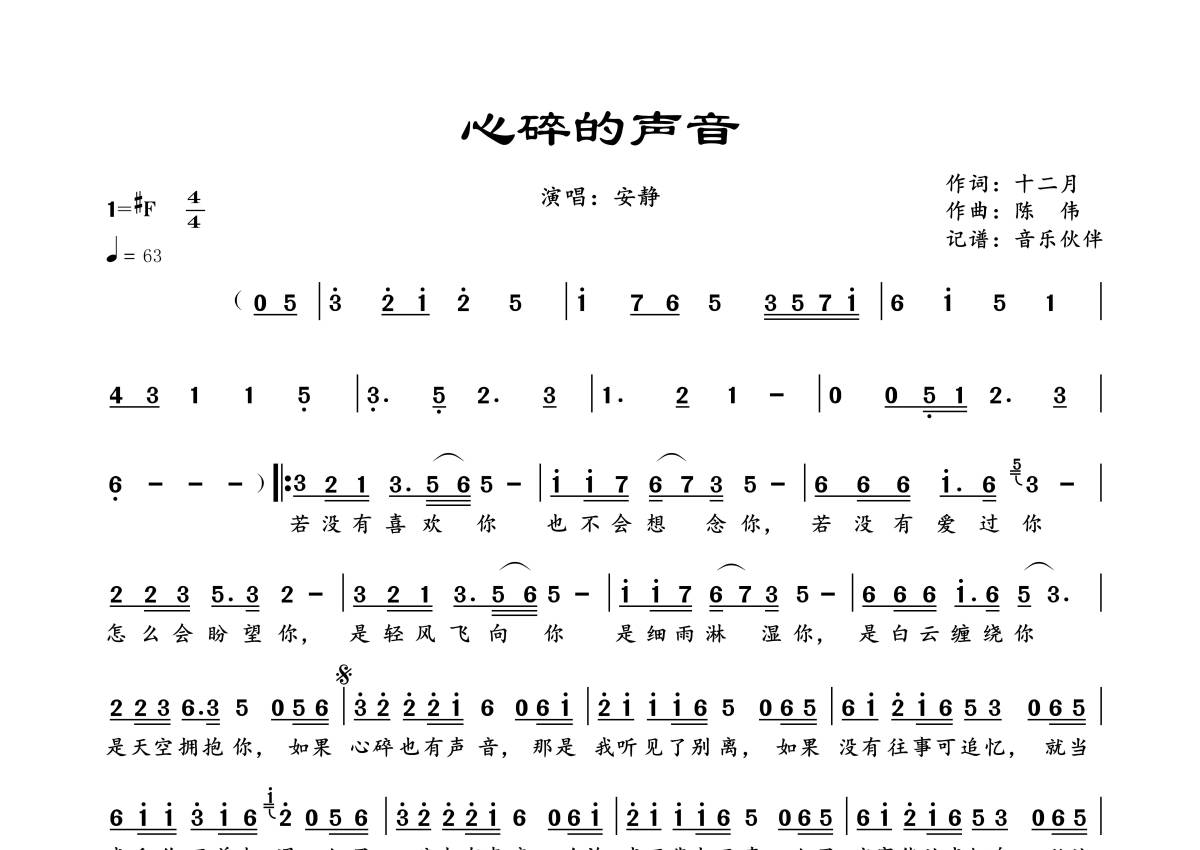 《心碎的声音》是安静演唱的一首歌曲,拍号为4/4拍,歌曲速度为每分钟63拍,这份简谱共有一张高清图谱,图谱由 @音乐伙伴 编配上传。