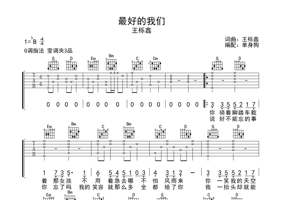 王栎鑫《最好的我们》吉他谱 - G调弹唱六线谱