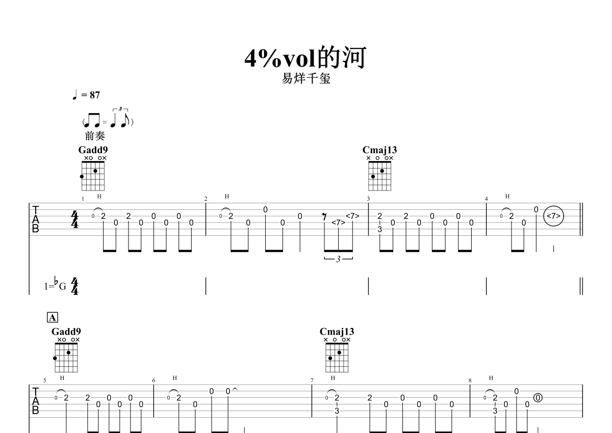 《4%vol的河》是易烊千玺演唱的一首歌曲,石头音乐原版记谱,拍号为4/4拍,歌曲速度为每分钟89拍,歌曲原调为Gb调,但由于原调指法比较难,为了方便弹奏,本吉他谱采用的是G调指法编配,降半音调弦弹奏即为原调,当然也可以根据自己的音域决定是否调弦,这份吉他谱共有四张高清图谱,图谱由 @石头音乐 编配上传,图谱使用六线谱编配,包含吉他和弦指法、简谱以及歌词部分,曲谱配备了相关的音频提供试听,使用这份4%vol的河吉他谱,可以让你更加方便地掌握这首歌曲的弹唱技巧,快来尝试吧。