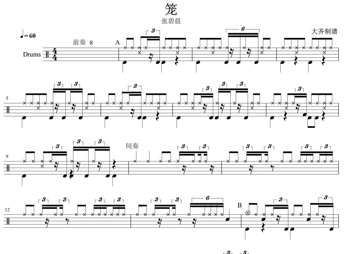 《笼》是张碧晨演唱的一首歌曲,拍号为4/4拍,歌曲速度为每分钟60拍,这份鼓谱共有两张高清图谱,图谱由 @大齐 编配上传,图谱使用五线谱编配,使用这份笼架子鼓谱,你将能够轻松地敲打出这首张碧晨的笼,快来尝试吧。