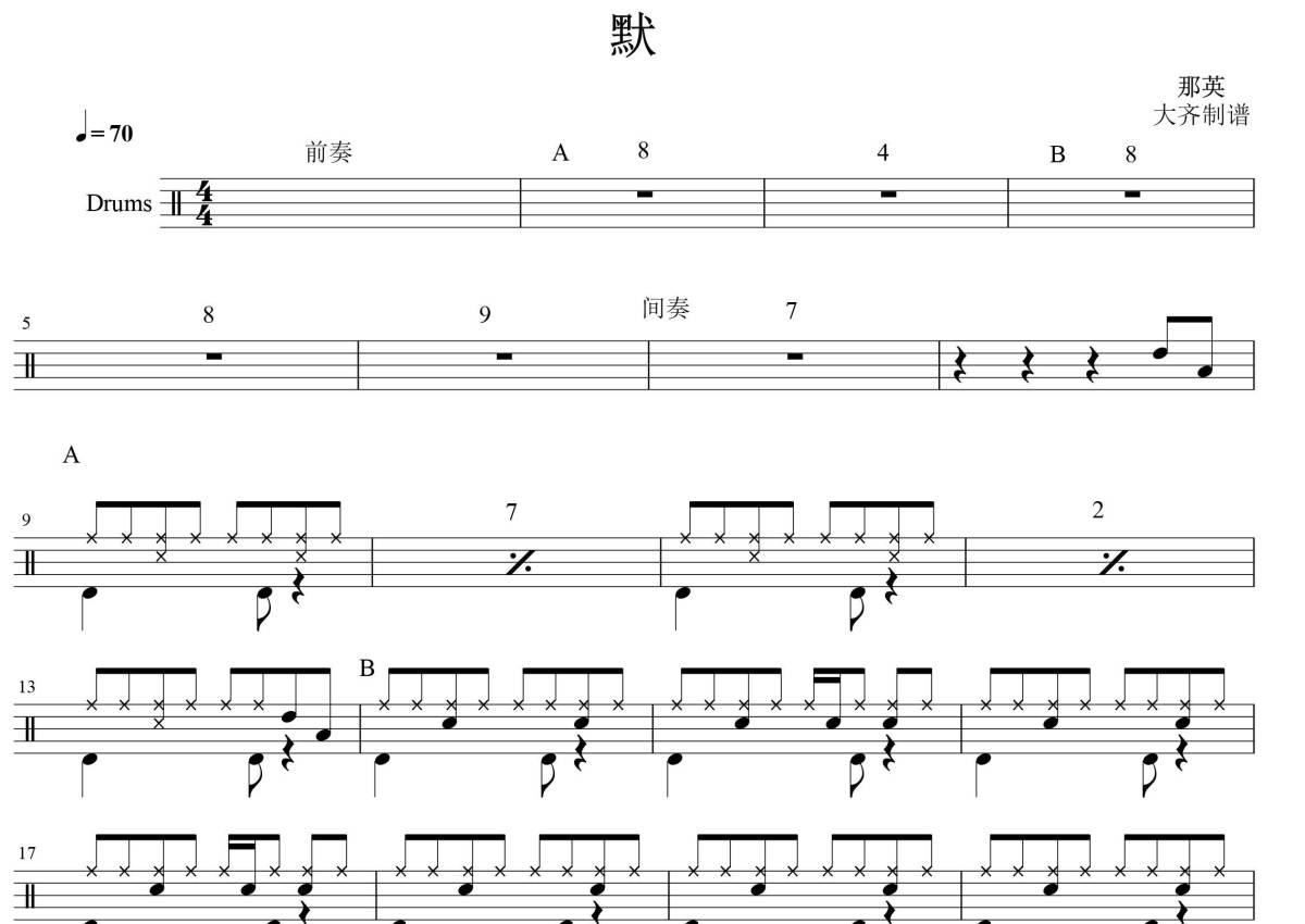 《默》是那英演唱的一首歌曲,拍号为4/4拍,歌曲速度为每分钟70拍,这份鼓谱共有一张高清图谱,图谱由 @大齐 编配上传,图谱使用五线谱编配,使用这份默架子鼓谱,你将能够轻松地敲打出这首那英的默,快来尝试吧。