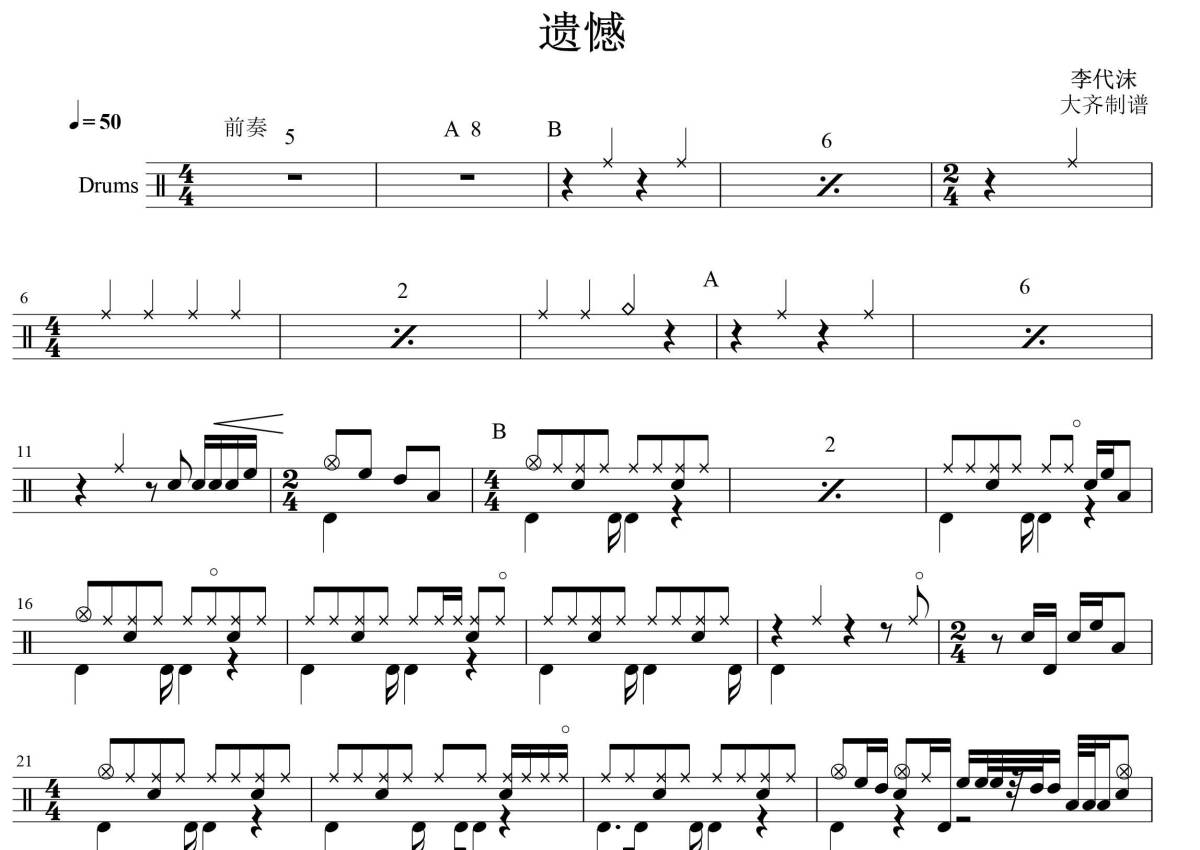 李代沫《遗憾》鼓谱 - 架子鼓谱