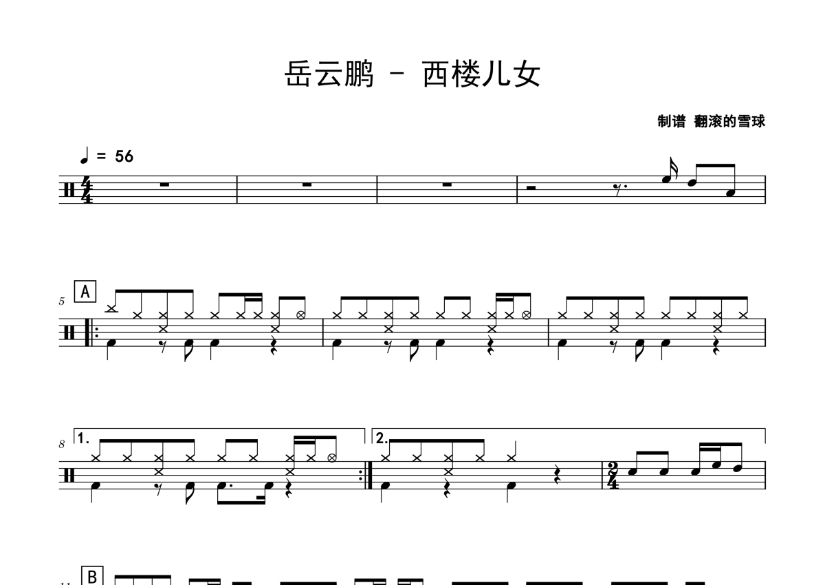 《西楼儿女》是岳云鹏演唱的一首歌曲,拍号为4/4拍,歌曲速度为每分钟56拍,这份鼓谱共有两张高清图谱,图谱由 @老虎不说谎 编配上传,图谱使用五线谱编配,使用这份西楼儿女架子鼓谱,你将能够轻松地敲打出这首岳云鹏的西楼儿女,快来尝试吧。