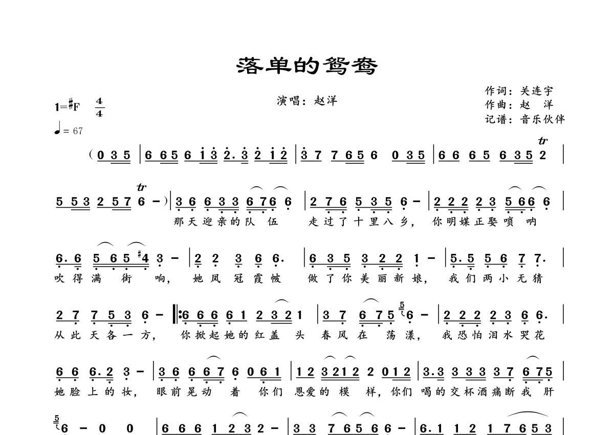 《落单的鸳鸯》是赵洋演唱的一首歌曲,拍号为4/4拍,歌曲速度为每分钟67拍,这份简谱共有一张高清图谱,图谱由 @音乐伙伴 编配上传。
