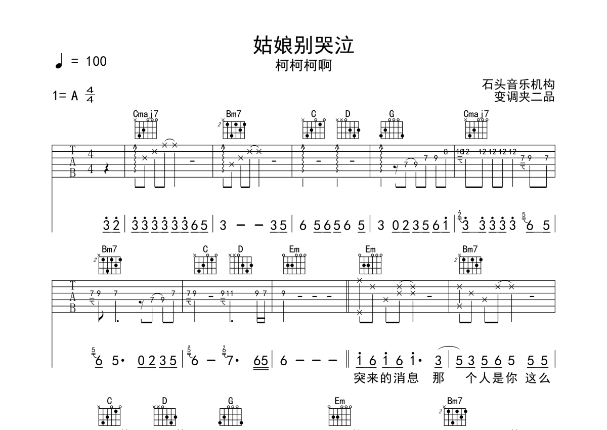 柯柯柯啊《姑娘别哭泣》吉他谱 - G调弹唱六线谱 - 石头音乐原版记谱
